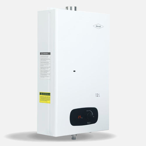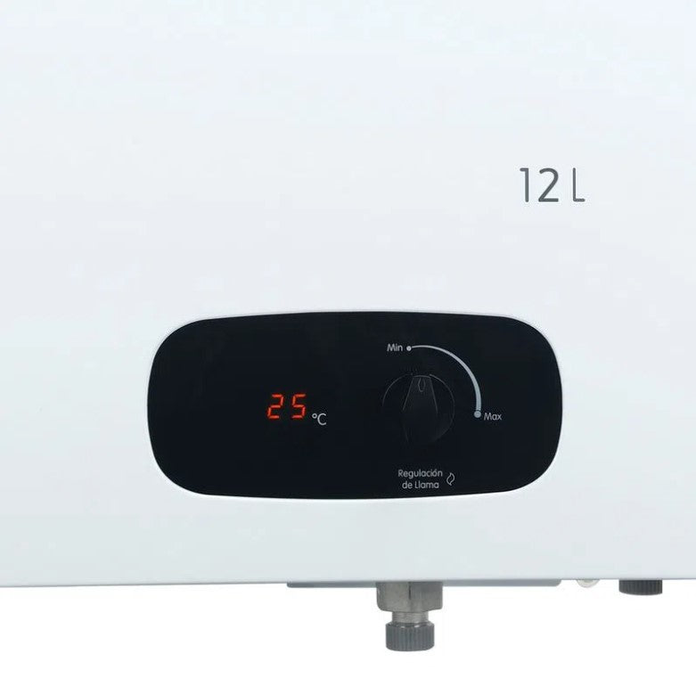 Calentador de agua de paso a gas 12 L / min tiro forzado, incluye ducto de evacuación de gases, se enciende de manera automática con solo abrir la llave y se apaga después de 40 minutos de uso continuo permitiendo controlar el tiempo de baño, temperatura regulable, cuenta con múltiples sistemas de seguridad y tiene display digital de temperatura.