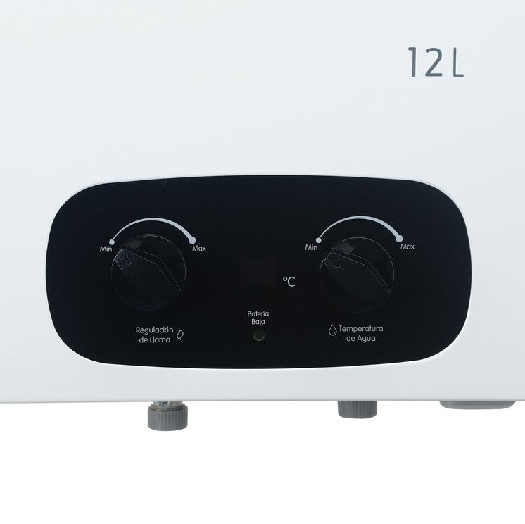 Calentador de agua de paso a gas 12 L / min tiro natural, se enciende de manera automática con solo abrir la llave y se apaga después de 20 minutos de uso continuo, permitiendo controlar el tiempo de baño, temperatura regulable, cuenta con múltiples sistemas de seguridad y tiene display digital de temperatura.